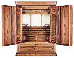 | 戸巾30号 高175*巾100*奥78 オプション:新八葉障子、浮き紐面角丸、大引付、彩色太子天井、厚彫無垢欄間、高欄台ダボ付、引出しロッキング、 膳引無垢フローリング、華柄丁番、脇箱付、桐箱付、余間ケコミ厚彫り、七福神欄間、堂造り、ケコミ桐引出し付 |